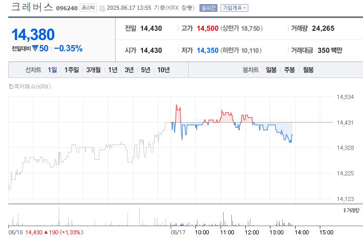 | 청담러닝 (096240, 크레버스) | 아동 교육 서비스 | 14,430원 |